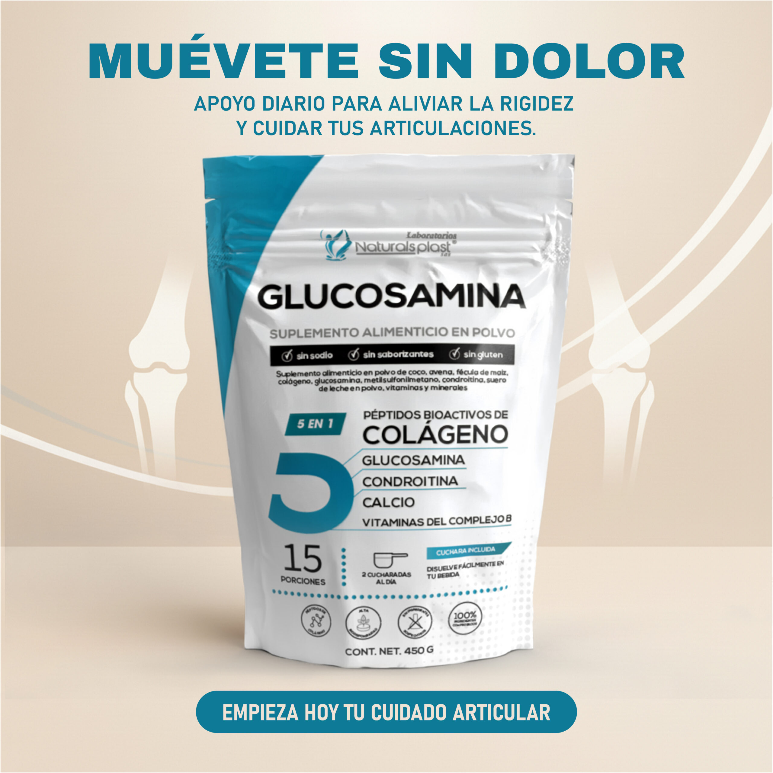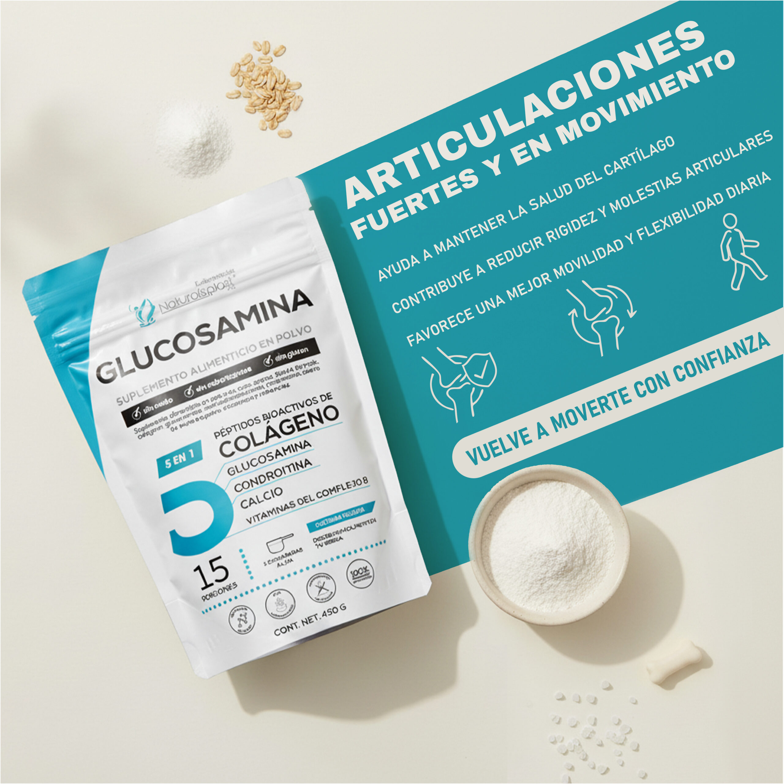 Contiene glucosamina, colágeno, condroitina, calcio y vitaminas del complejo B, que suelen usarse para: